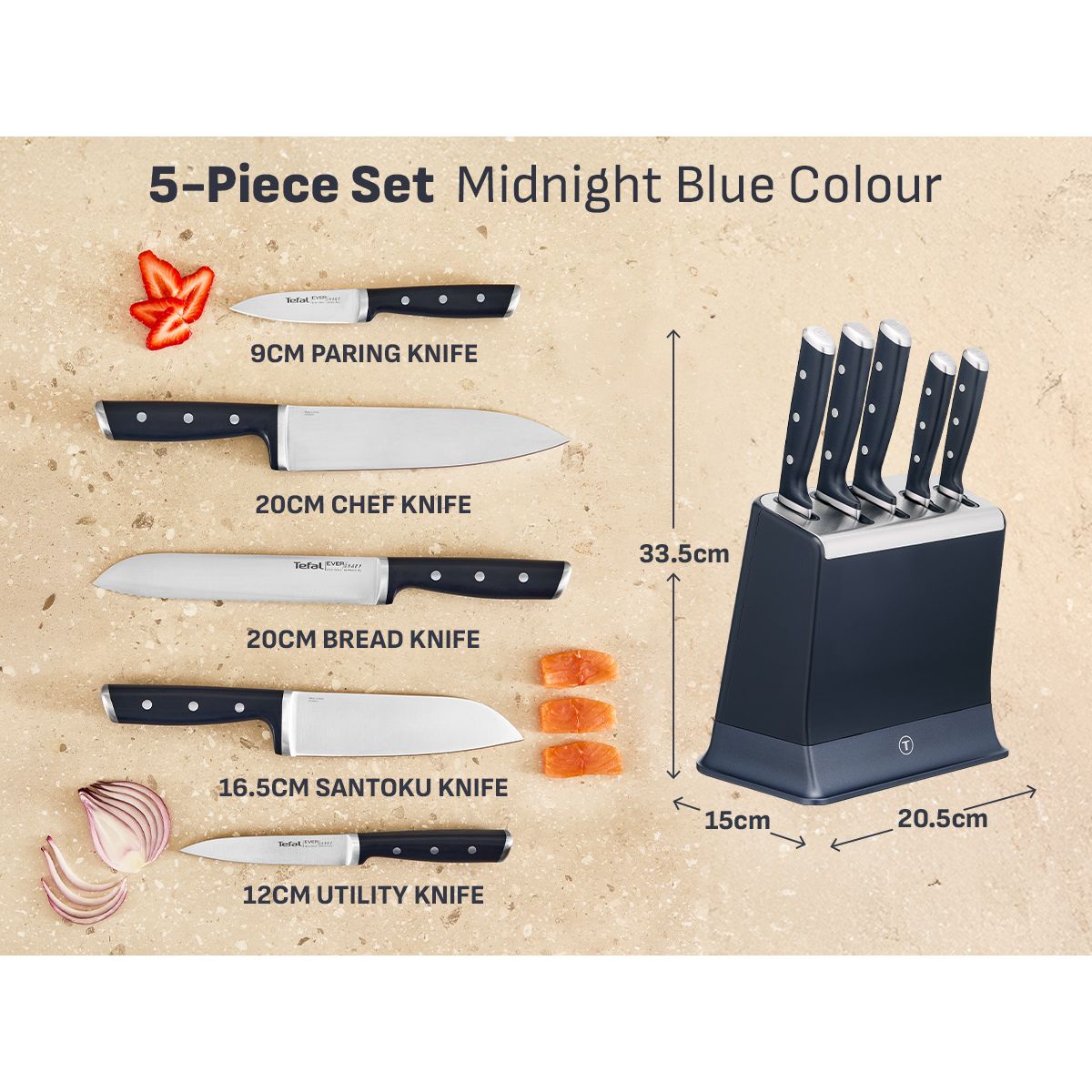 The TEFAL EverSharp Pro knife block set includes 5 universal blades: a 20 cm chef's knife for slicing fruit, vegetables, meat, or chopping herbs, a 20 cm serrated bread knife, a 16.5 cm Santoku knife, a 12 cm universal fruit and vegetable knife, and a 9 cm paring knife.